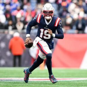 Jan 5, 2025; Foxborough, Massachusetts, USA; New England Patriots quarterback Joe Milton III (19) runs against the Buffalo Bills during the first half at Gillette Stadium. Mandatory…